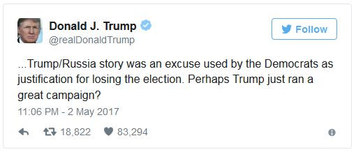 Chẳng hạn, sau khi cựu giám đốc Cục Điều tra Liên bang Mỹ (FBI) James Comey điều trần về cuộc trao đổi giữa ông và tổng thống, ông Trump đã im hơi lặng tiếng trên mạng xã hội - cho đến sáng ngày hôm sau. Ông viết trên tài khoản Twitter: "Toàn là dối trá ... trời, Comey làm lộ bí mật quốc gia kìa!" và "Tôi nghĩ rò rỉ thông tin kiểu James Comey phổ biến hơn tất cả mọi người tưởng tượng. Quá phạm pháp? Thật 'hèn nhát'!"