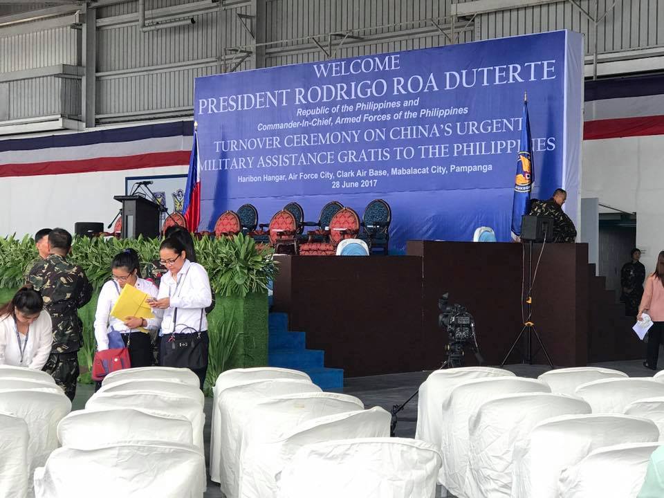 Tổng thống Philippines Duterte - người đột ngột không xuất hiện trước công chúng gần đây với tin đồn đang bị ốm cũng đã có mặt trong buổi bàn giao vũ khí quà tặng của Trung Quốc