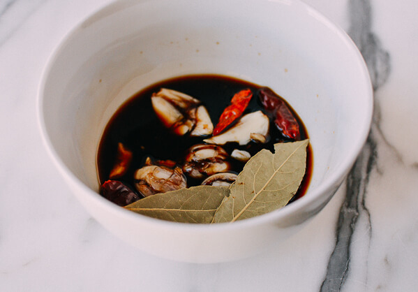 - Cho tất cả chỗ đường và chỗ muối còn lại, cùng với xì dầu đặc, nước tương, giấm, lá nguyệt quế, tỏi, ớt vào một cái bát to. Khuấy nhẹ sao cho muối, đường tan hết và tất cả được trộn thật đều.