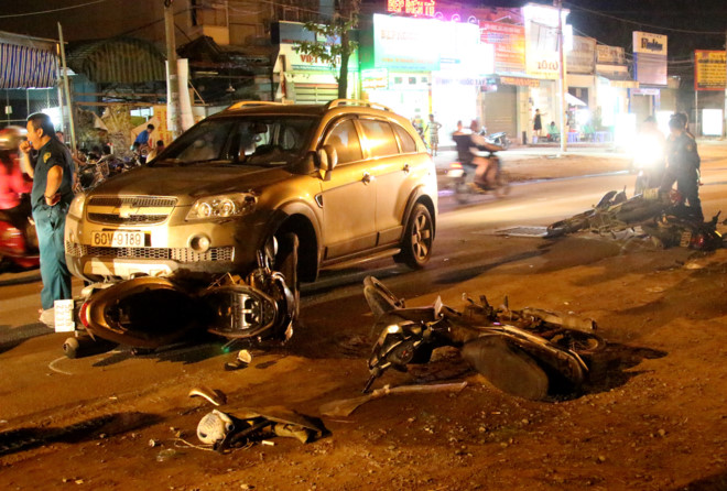 Một vụ tai nạn giao thông kinh hoàng xảy ra ở TP. HCM vào tối qua 30/6. Người gây tai nạn mặc trang phục của ngành công an, khoảng 35 tuổi. Anh ta lái ôtô chạy trên đường Đỗ Xuân Hợp (TP.HCM) bất ngờ va chạm với 4 xe máy. Vụ tai nạn khiến nhiều người bị thương.