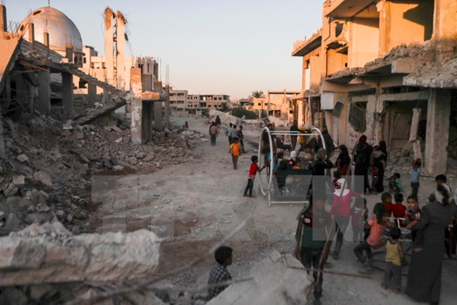 Trẻ em Syria chơi đùa bên cạnh những ngôi nhà đổ nát tại khu vực ngoại ô Al-Nashabiyah, ngày 26/6.