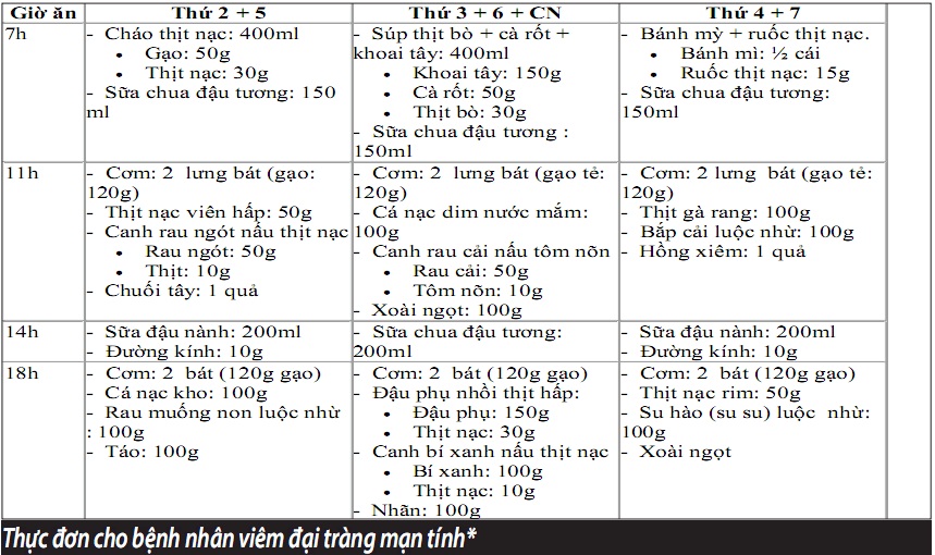 Những người viêm đại tràng mạn tính cần có một chế độ ăn để cải thiện sức khỏe và đẩy lui bệnh tật. Ngoài việc dùng thuốc theo đúng chỉ thị của bác sĩ thì phải có chế độ ăn uống hợp lý và khoa học. Việc thay đổi chế độ dinh dưỡng tùy theo giai đoạn của bệnh góp phần làm giảm sự kích thích niêm mạc của đại tràng, giúp cho đại tràng có cơ hội được nghỉ ngơi nhằm nâng cao khả năng hồi phục đại tràng.
