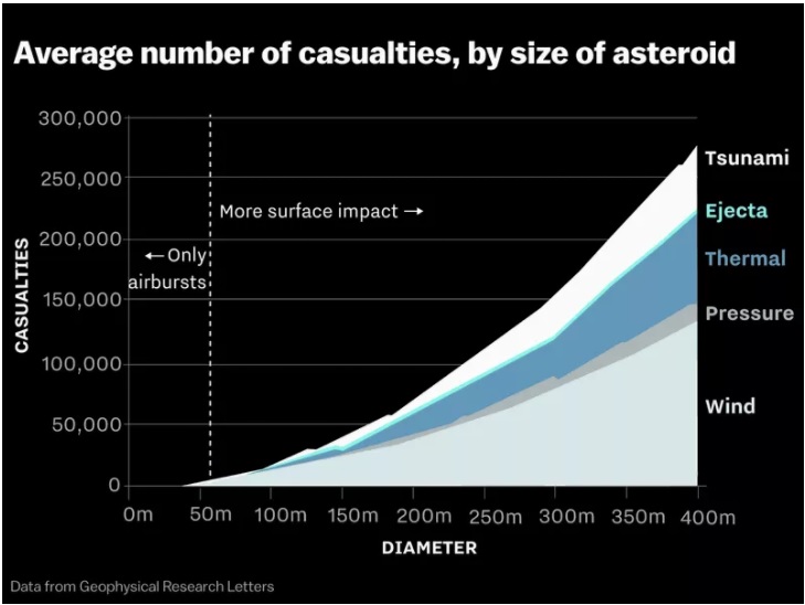 Kích thước thiên thạch càng tăng lên, nguyên nhân khiến con người thiệt mạng cũng đa dạng hơn. Nhưng gió tử thần vẫn là thứ tàn sát nhân loại hàng đầu. 60% các ca tử vong khi tiểu hành tinh va vào Trái đất là do gió tử thần và áp suất, theo nghiên cứu.
