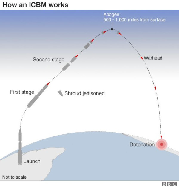 Các giai đoạn trong hành tŕnh bay của tên lửa đạn đạo liên lục địa từ bệ phóng tới mục tiêu. Đồ họa: BBC.