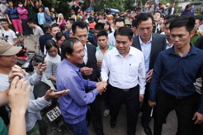 Chủ tịch Hà Nội Nguyễn Đức Chung gặp gỡ người dân xã Đồng Tâm và ký giấy trắng mực đen cam kết nhiều điều nhưng nay mọi việc trở thành một kiểu “khôi hài đỏ”. (Hình: STR/AFP/Getty Images)