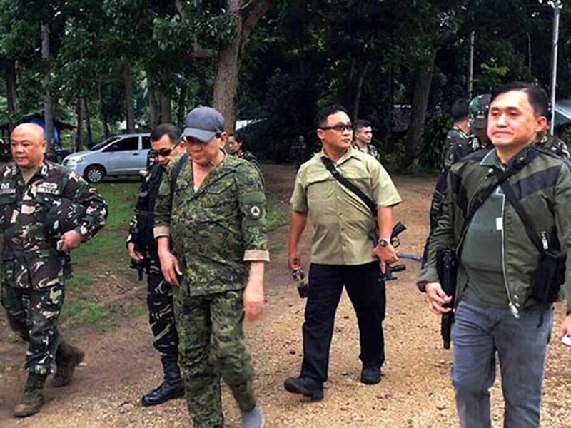 Tổng thống Duterte (đội mũ) mặc quân phục và vác súng trường tấn công trong chuyến đi bất thành đến TP Marawi vào ngày 7-7. Ảnh: PHILSTAR