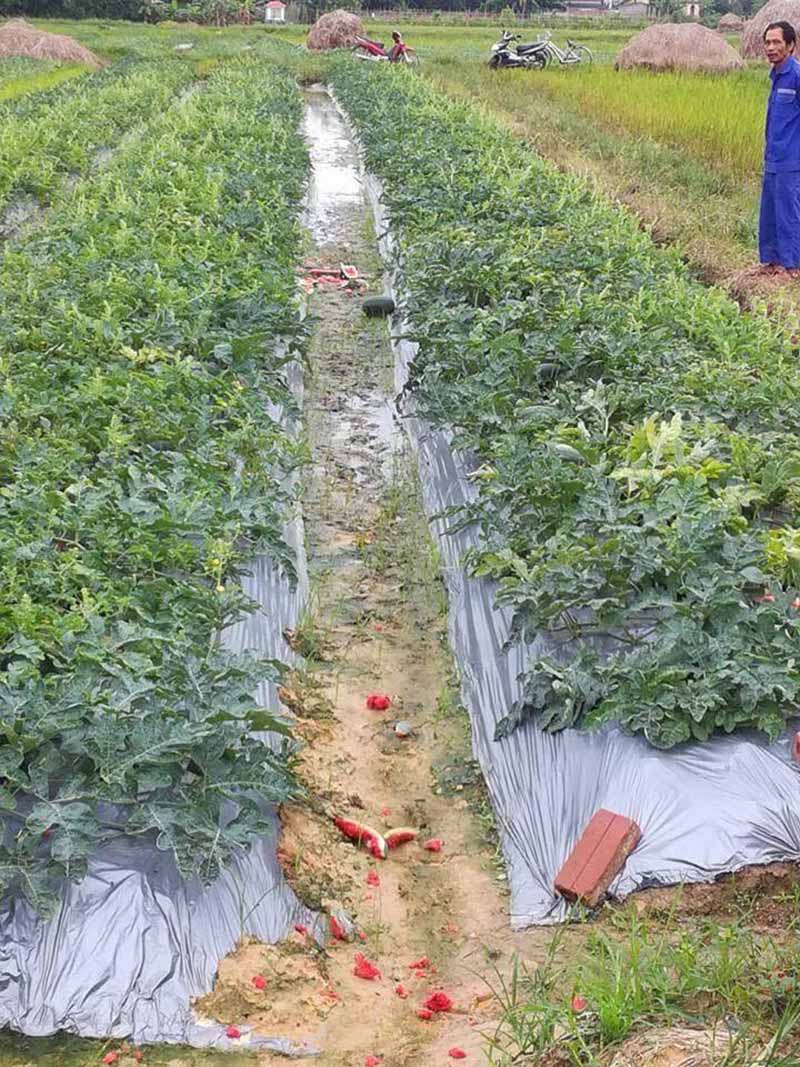 Qua tìm hiểu, ruộng dưa bị kẻ xấu trộm nhiều quả chín đến kỳ thu hoạch, đồng thời đập nát những quả dưa non.