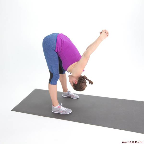 Đứng thẳng, hai chân rộng bằng một vai, hay tay nắm lấy nhau, để phía sau lưng. Cúi gập người, tay đưa thẳng lên trời. Lặp lại động tác 20 lần.