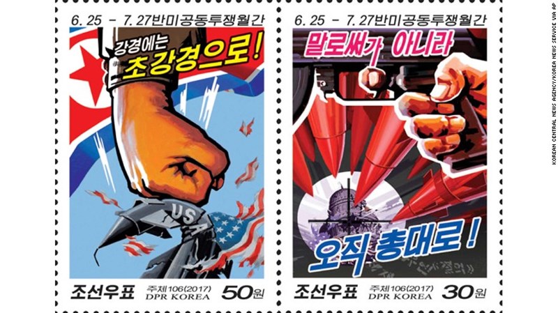 CNN đã đăng hai bức ảnh về hai loại tem mới nhất chống Mỹ. Một trong số đó là hình ảnh đầu đạn hạt nhân lao về phía đồi Capitol, nơi có tòa nhà Quốc hội Mỹ hay cú đấm đập tan tên lửa Mỹ.
