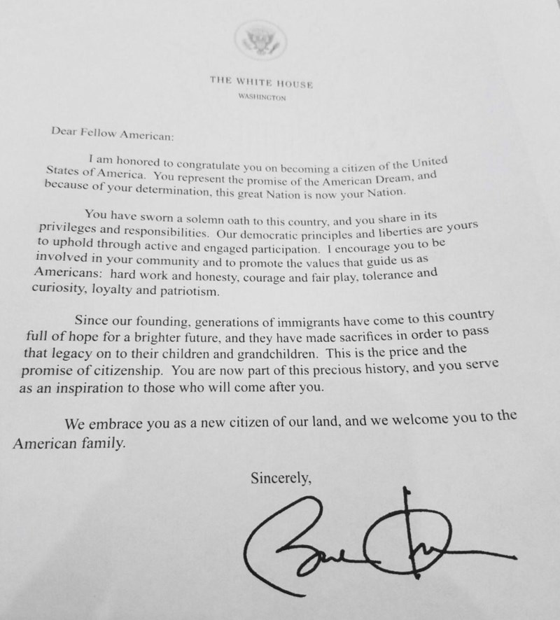 “Chúng tôi chào mừng ông là công dân mới của đất nước chúng ta, chào mừng ông đến với gia đình Mỹ” – bức thư viết, cùng chữ ký của ông Obama.