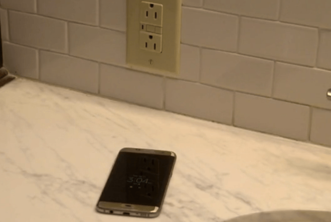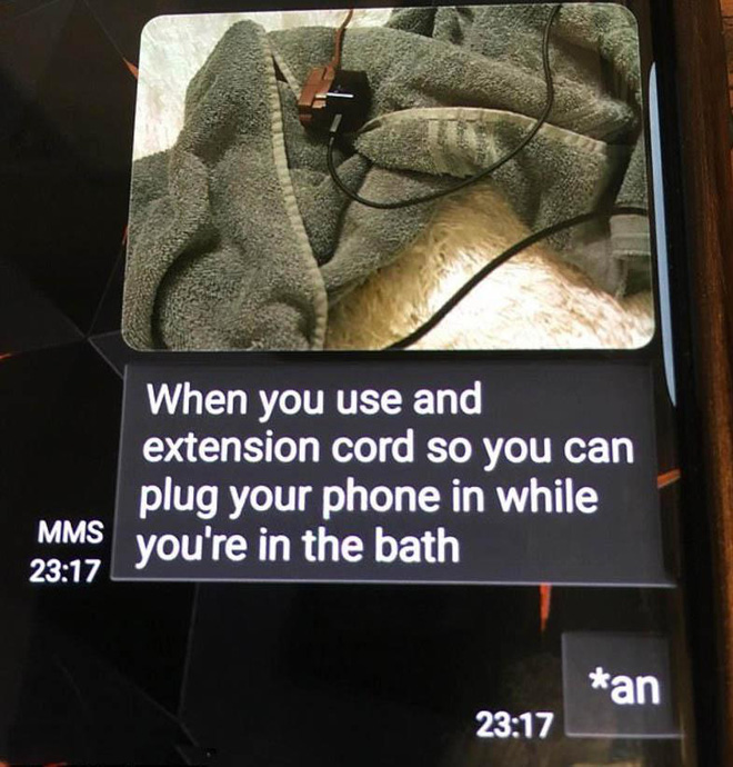 Tin nhắn với nội dung “Nếu sử dụng dây nối dài, bạn có thể cắm được điện thoại khi đang trong bồn tắm” đã được gửi đi cùng bức ảnh chụp thiết bị nối dài từ ổ điện tới điện thoại và được đặt trên chiếc khăn tắm.