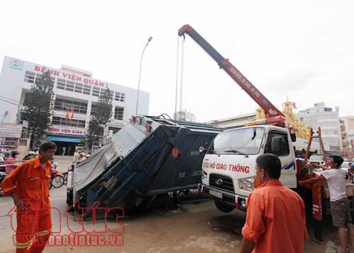 xe rác bị lật nghiêng do bất ngờ xuất hiện hố tử thần.
