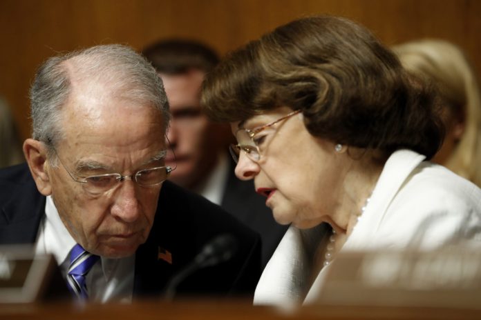 Hai thượng nghị sĩ Grassley (trái) và Feinstein thảo luận trong phiên họp của Ủy Ban Tư Pháp Thượng Viện.