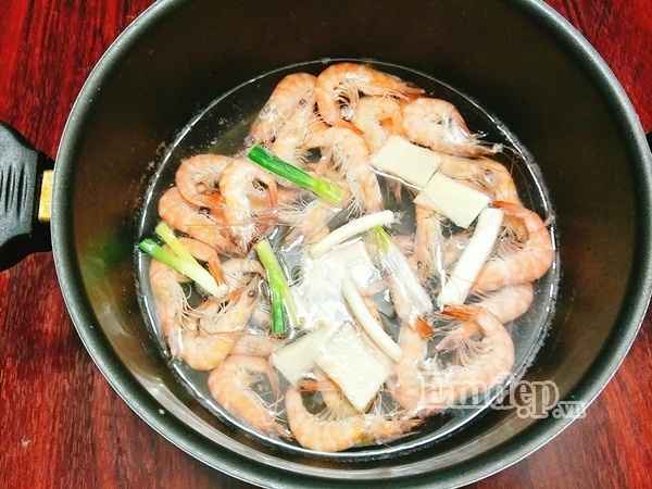 Bước 4: Cho nước vào nồi đun sôi thì cho gừng thái lát, gốc hành trắng, 2 thìa rượu trắng cùng với tôm vào luộc cho vừa chín là tắt bếp.