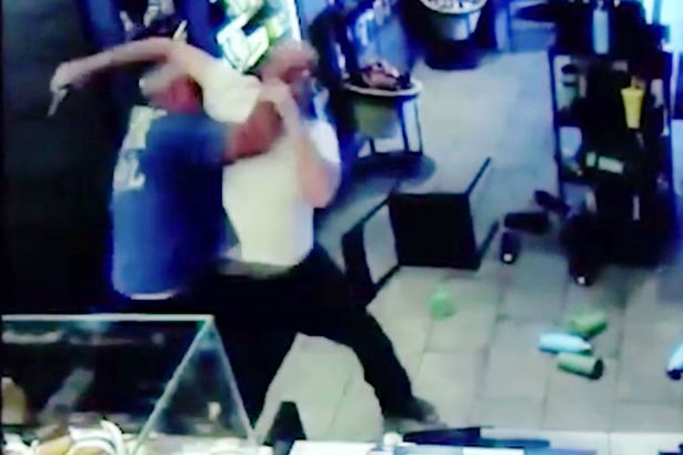 Cregg Jerri, 58 tuổi và nghi phạm Ryan Florez, 30 tuổi, đều bị đâm trong cuộc vật lộn, được ghi lại bởi camera an ninh của cửa hàng ở Fresno, California, vào lúc 5 giờ chiều ngày 20.7.