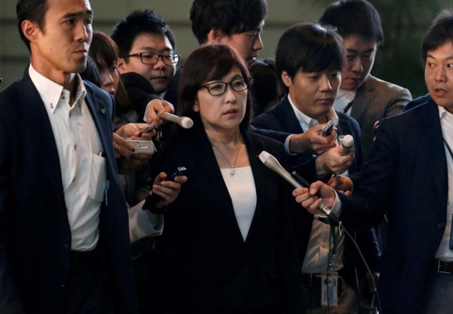 Bộ trưởng Quốc phòng Tomoni Inada bị bao quanh bởi các phóng viên. Ảnh: Reuters