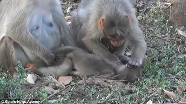 Khỉ mẹ và một con khỉ cái trong đàn tìm mọi cách để cứu sống khỉ con.