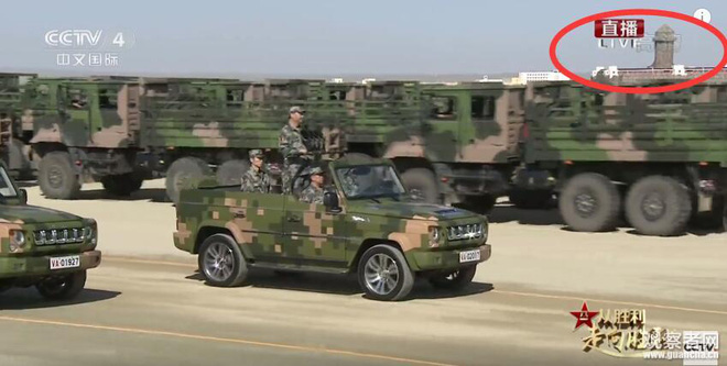Hình ảnh tòa nhà nghi vấn xuất hiện trong lễ duyệt binh của PLA sáng 30/7. Ảnh Guancha