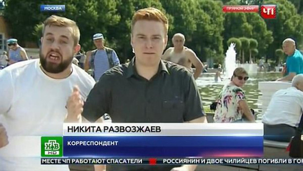 Khi đang mải ghi hình về không khí sôi động trước thời điểm tổ chức buổi lễ thường niên nhằm kỷ niệm Ngày Lính dù Nga 02/08, nam phóng viên Nikita Razvozzhayev của đài truyền hình NTV đã bất ngờ gặp phải rắc rối với một người đàn ông có dấu hiệu say xỉn.