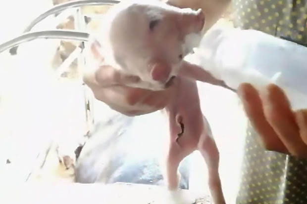 Video cho thấy cả hai đầu của lợn bú bình sữa do một người phụ nữ cầm - người có thể là chủ nhân của nó.