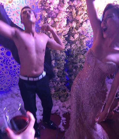 “Quẩy” nhiệt tình trong After Party, Lương Thế Thành bị bạn bè lột trần. Trước đó, vì quá hạnh phúc nên chú rể đã uống khá nhiều rượu mừng. Cô dâu Thúy Diễm cũng rơi vào tình huống ngượng ngùng tương tự khi mải xô đẩy khiến váy áo trễ nải, lấp ló gần hết khuôn ngực.
