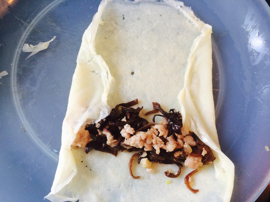 + Tráng bánh: Bắc chảo chống dính lên bếp, khi chảo thật nóng lấy vá múc bột đổ dàn đều lên mặt chảo. Khi bột vừa chín tới thì lấy bánh ra trải trên cái khay, múc một muỗng nhân thịt cho vào một phía, sau đó cuộn bánh lại rồi cho ra đĩa. Lần lượt làm như vậy cho đến khi hết bột và nhân, cho ra những đĩa bánh nóng hổi thơm lừng.