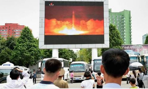 Người dân Triều Tiên xem bản tin về vụ thử tên lửa đạn đạo xuyên lục địa (ICBM) tại bến xe ở Bình Nhưỡng. Ảnh: Reuters.