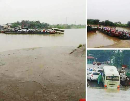 Hình ảnh ôtô khách nửa trên phà, nửa "tắm sông" khi qua phà Mây (Hải Dương). Ảnh: CTV