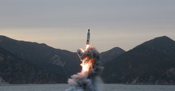 Hình ảnh một vụ phóng thử tên lửa từ tàu ngầm do hãng thông tấn Triều Tiên KCNA công bố tháng 4/2016. Ảnh: KCNA.