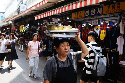 Một phụ nữ đang đội thức ăn trên đầu trong khu chợ truyền thống Namdaemun tại thủ đô Seoul, Nam Hàn ngày thứ Sáu, 11 tháng Tám. Cộng Sản Bắc Hàn đã dọa bắn đảo Guam của Mỹ ở Thái Bình Dương. Nếu vụ tấn công đó xảy ra, hỏa tiễn sẽ bay qua không phận Nam Hàn trên đường đến Guam, tức là Bắc Hàn có đủ khả năng để tấn công Nam Hàn bằng hàng loạt hỏa tiễn. (Chung Sung-Jun/ Getty Images)
