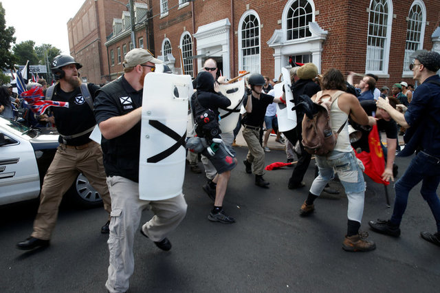 Nhưng xô xát đã xảy ra giữa những người da trắng dự kiến tham gia cuộc tuần hành và đám đông biểu tình, trong đó có nhiều người da màu, phản đối tuần hành tại thành phố Charlottesville, khiến ít nhất 15 người bị thương. (Ảnh: Reuters)
