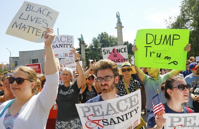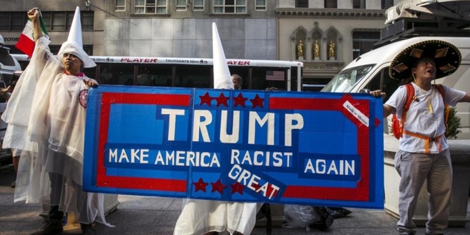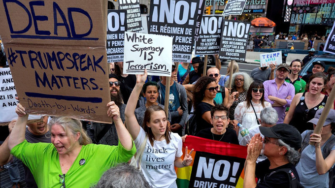 Hàng nghìn người Mỹ đã biểu tình trước Tháp Trump, New York. Họ giương khẩu hiệu phản đối nạn phân biệt chủng tộc. Biểu ngữ "Make America racist again" (Khiến nước Mỹ phân biệt chủng tộc một lần nữa), nhại lại câu khẩu hiệu tranh cử của tổng thống Mỹ Donald Trump.