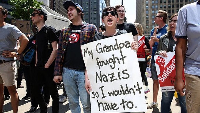 Một phụ nữ biểu tình với biểu ngữ "Ông tôi đã chiến đấu với phát xít để tôi không phải làm (điều tương tự)".
