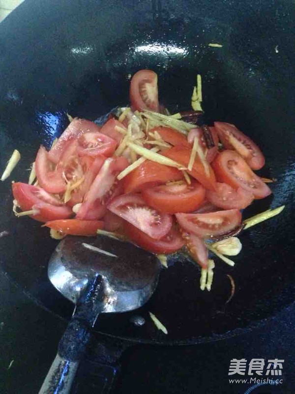 - Làm nóng dầu trong nồi, cho gừng, tỏi, ớt và cà chua vào xào tới khi thơm.