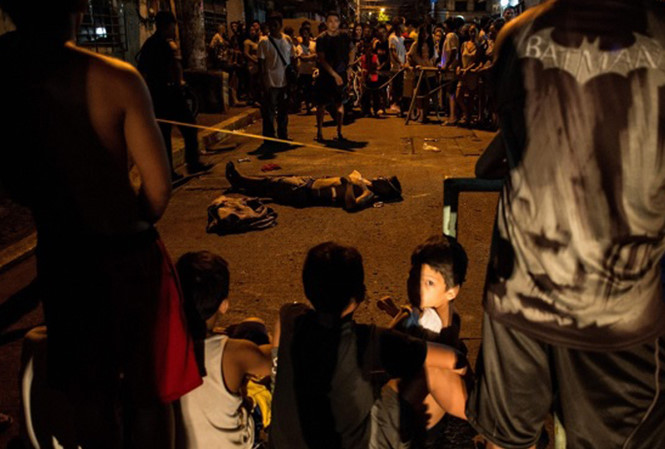 Người dân Philippines tới xem nghi can ma túy bị bắn chết trên đường phố. Ảnh: AP.