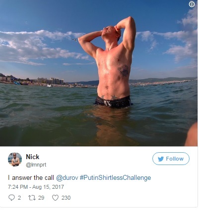 Pavel Durov, người sáng lập mạng xã hội VKontakte và Telegram, đã khởi động xu hướng chụp ảnh này với hashtag #PutinShirtlessChall enge (Thử thách cởi trần giống Putin) bằng chính bức ảnh của mình.