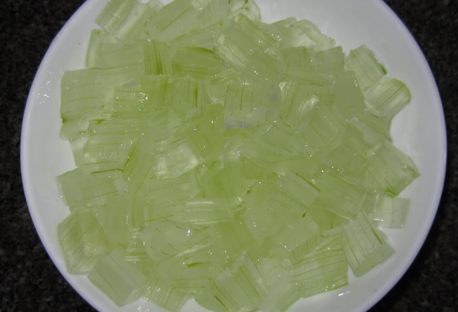 Nha đam sau khi đã làm sạch nhớt, bạn đem nha đam xắt hạt lựu. Tiếp theo, bạn lại rửa kỹ nha đam với nước cho sạch thêm một lần nữa rồi vẩy cho ráo.