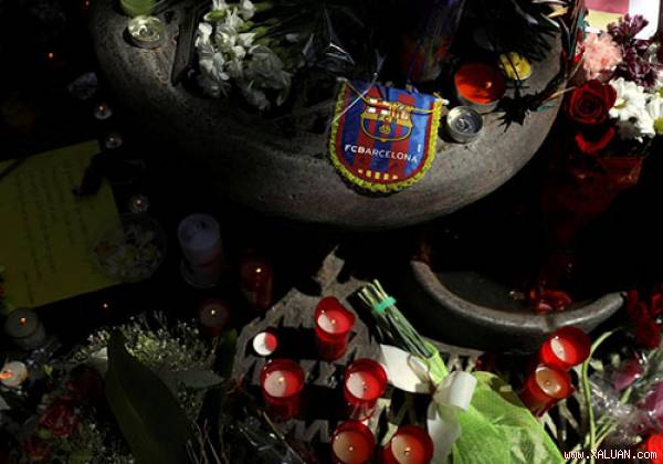 Người qua đường đặt vòng hoa và nến tại khu phố đi bộ Las Ramblas, Barcelona, Tây Ban Nha để tưởng nhớ các nạn nhân thiệt mạng trong vụ khủng bố hôm 17/8. Ảnh: Reuters.