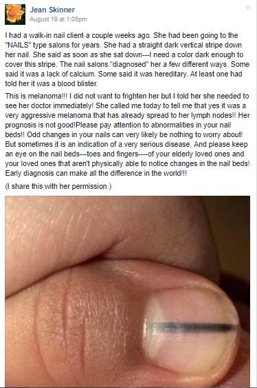 Xin nhắc nhở mọi người cần chú ý đến dấu hiệu bất thường trên móng tay. Bạn có thể chẳng bao giờ chú ý tới những thay đổi bất thường trên móng. Nhưng cũng có lúc chúng chính là điềm báo của bệnh nặng! Xin hãy chú ý đến móng của bạn cũng như những người xung quanh, cả móng tay và móng chân, đặc biệt là những người thường không chú ý tới những dấu hiệu nhỏ như vậy, chẩn đoán sớm thì mới có thể thay đổi tình hình bệnh.“