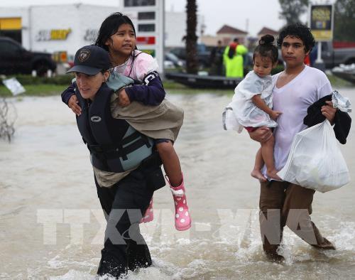Người dân sơ tán khỏi các khu vực ngập lụt ở Houston, Texas ngày 28/8. AFP/TTXVN