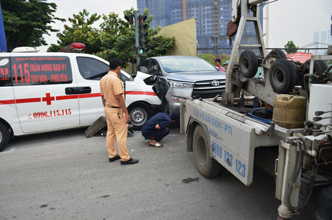 6h sáng nay, xe cứu thương biển số Phú Yên chở bệnh nhân lưu thông trên đại lộ Mai Chí Thọ, hướng từ xa lộ Hà Nội về hầm Thủ Thiêm, khi đến giao lộ Trần Não (quận 2, TP.HCM) thì va chạm vào ô tô 7 chỗ đang rẽ trái.