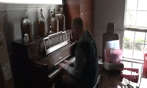 Old  English Mục sư Texas bình thản chơi piano trong căn nhà ngập nước