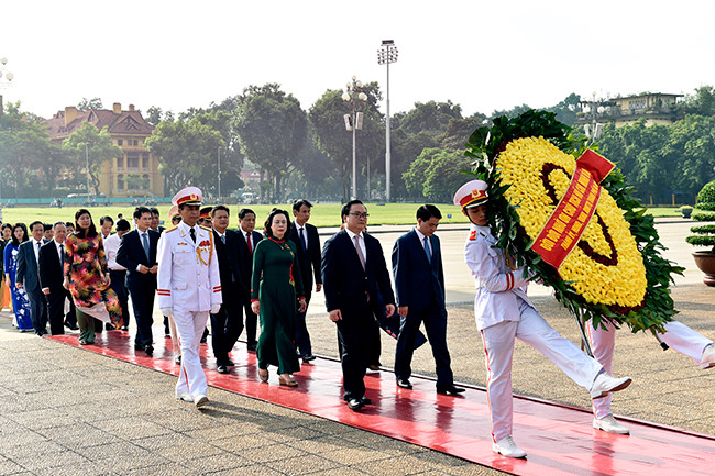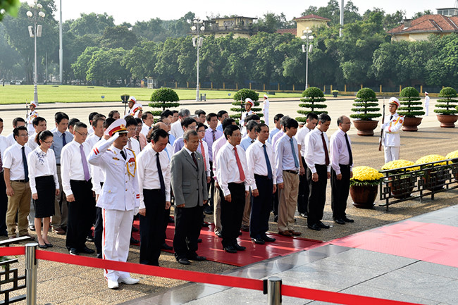 Vòng hoa của đoàn mang dòng chữ: "Đời đời nhớ ơn Chủ tịch Hồ Chí Minh vĩ đại". Trong không khí trang nghiêm, các vị lãnh đạo Đảng, Nhà nước đã thành kính tưởng nhớ Chủ tịch Hồ Chí Minh, bày tỏ lòng biết ơn vô hạn đối với vị lãnh tụ, Anh hùng giải phóng dân tộc, người thầy vĩ đại của cách mạng Việt Nam.