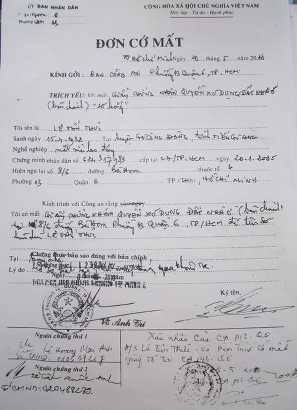 Ngay sau đó, cụ Thức đã có đơn trình báo sự việc với Công an phường nhưng cơ quan này hướng dẫn cụ làm đơn mất giấy tờ theo mẫu và xác nhận vào đơn ngày 25-5-2010. Đồng thời, cụ Thức còn đến Văn phòng Đăng ký quyền sử dụng đất (VPĐKQSDĐ) - Phòng Tài nguyên - Môi trường (TN - MT) quận 6 làm phiếu yêu cầu trích lục đề ngày 8-6-2010 theo mẫu số 01/TTĐĐ. Sau đó, VPĐKQSDĐ đã cấp lại bản trích lục GCN QSHNĐ nhưng điều lạ lùng là cơ quan này lại không ghi ngày tháng năm cấp.