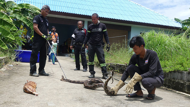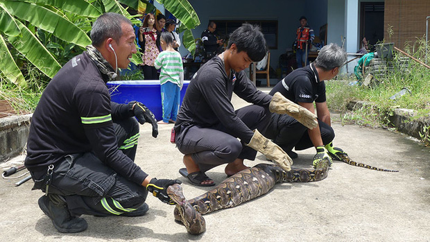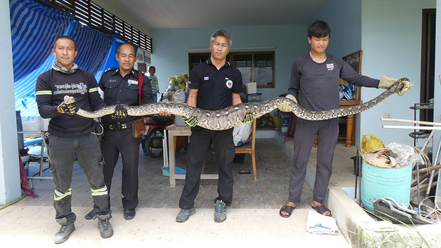 Saowarak Charoen, 59 tuổi cho biết con trăn dài 5m đã lẻn vào nhà bà tại khu Pathum Thani và nuốt chú mèo cưng Bobo. Sau đó, nó đã cuốn mình, nằm gọn dưới một chậu với dự định tiêu hóa nốt bữa ăn của mình. Tuy nhiên, bà Saowarak đã phát hiện ra con trăn và báo với đội cứu hộ địa phương.