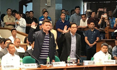 Con trai Tổng thống ông Paolo Duterte và con rể tổng thống Manases Carpio tuyên thệ khi điều trần trước Thượng viện. Ảnh: Inquirer.