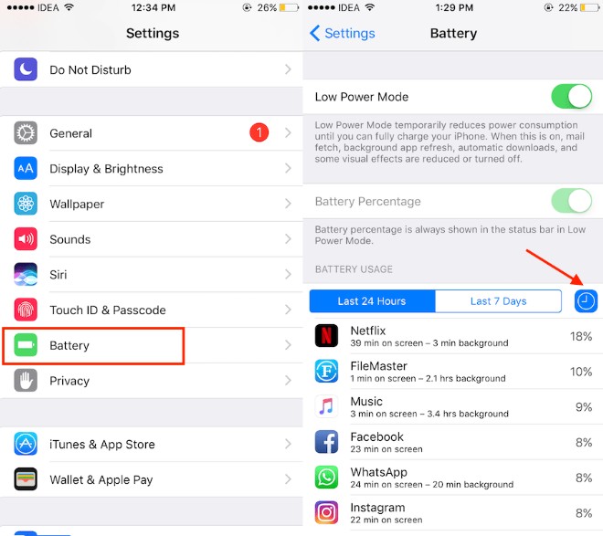 - Đợi vài giây để iOS tải dữ liệu sử dụng pin cho từng ứng dụng. Sau khi tải hãy nhấn vào biểu tượng đồng hồ ở trên cùng bên phải để xem các sử dụng của từng ứng dụng.