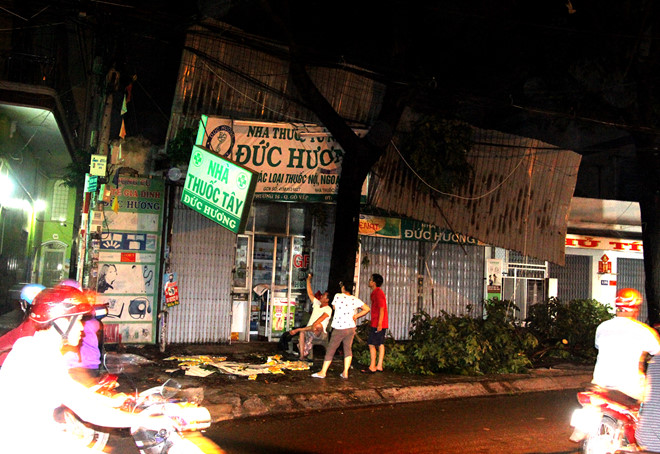 Theo ghi nhận của ****.vn, có khoảng 10 cây tét nhánh đè lên mái nhà dân. Tại tiệm thuốc Tây ở số 34 Lê Văn Thọ, nhánh cây đè sập mái và gây hư hỏng nhiều tài sản bên trong. Nước mưa còn làm nhiều hiệu thuốc Tây trong tiệm hư hỏng.