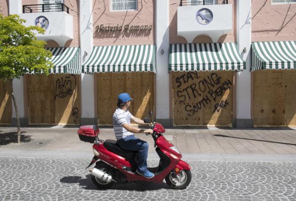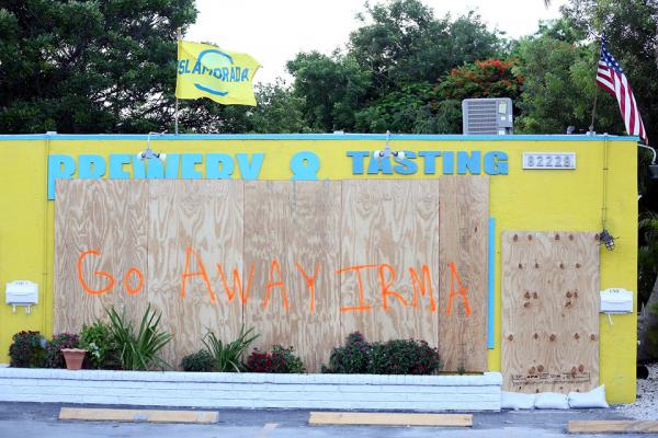 Theo ước tính, Florida sẽ thiệt hại hàng trăm tỷ USD do cơn bão. Trong ảnh, một cửa hàng được gia cố phần cửa với những tấm gỗ ghi dòng chữ "Đừng mở ra, mở ra sẽ chết. Irma hãy đi đi".
