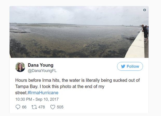 Chỉ vài giờ sau khi Irma "đánh" vào bang Florida (vào Chủ nhật ngày 10/9 giờ địa phương) với sức gió lên tới 230 km/giờ, toàn bộ nước biển của Vịnh Tampa bị hút sạch!
